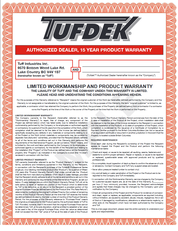No one provides a more comprehensive product and labor warranty than an Authorized Tufdek Dealer. Tufdek Authorized Dealers will supply a written Tuff Industries Waterproofing warranty and a Tufdek Dealer Labor warranty upon the completion of the installation of your rooftop decking material. The Tufdek product warranty is for 15 years and the Authorized Dealer labor warranty is covered for 5 years. This should provide confidence when it comes to your waterproof protection.